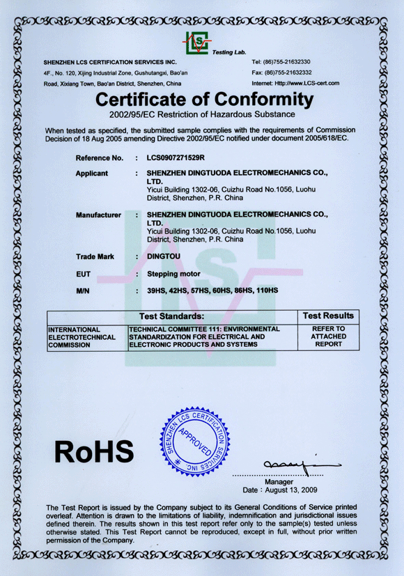 首頁->產(chǎn)品認證->步進電機RoHS認證證書